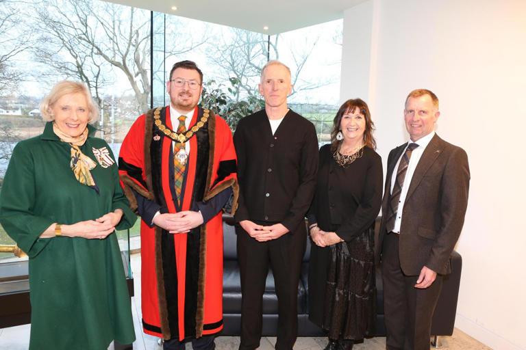 Deputy Mayor of Causeway Coast and Glens, Alderman Richard Brown Stewart, pictured with new High Sheriff of County Londonderry, Peter Jack MBE, his wife Sharon and his predecessor Ian Henry MBE, along with Lord Lieutenant of County Londonderry Alison Millar at the handover ceremony in Cloonavin. (Photo:©CCGBC)